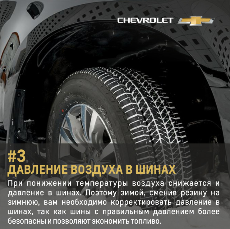 В современных автомобилях, в частностях в Chevrolet, водитель может контролировать уровень давления в шинах не выходя из автомобиля. На приборной панели бортовой компьютер выводит данные каждого колеса.