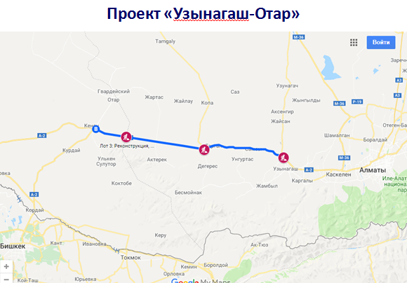 "Проектом предусмотрена реконструкция дороги Узынагаш - Отар под категорию 1-Б (скоростные автомобильные дороги международного или респуб­ликанского значения, не отнесенные к категории 1-А - Прим. Автора), с четырехполосным движением, ширина проезжей части: 15 метров, а также мосты и путепроводы: 12 штук. В настоящее время ведутся строительные работы на участке протяженностью 55 километров. Завершение запланировано на 2020 год", - говорится в сообщении.