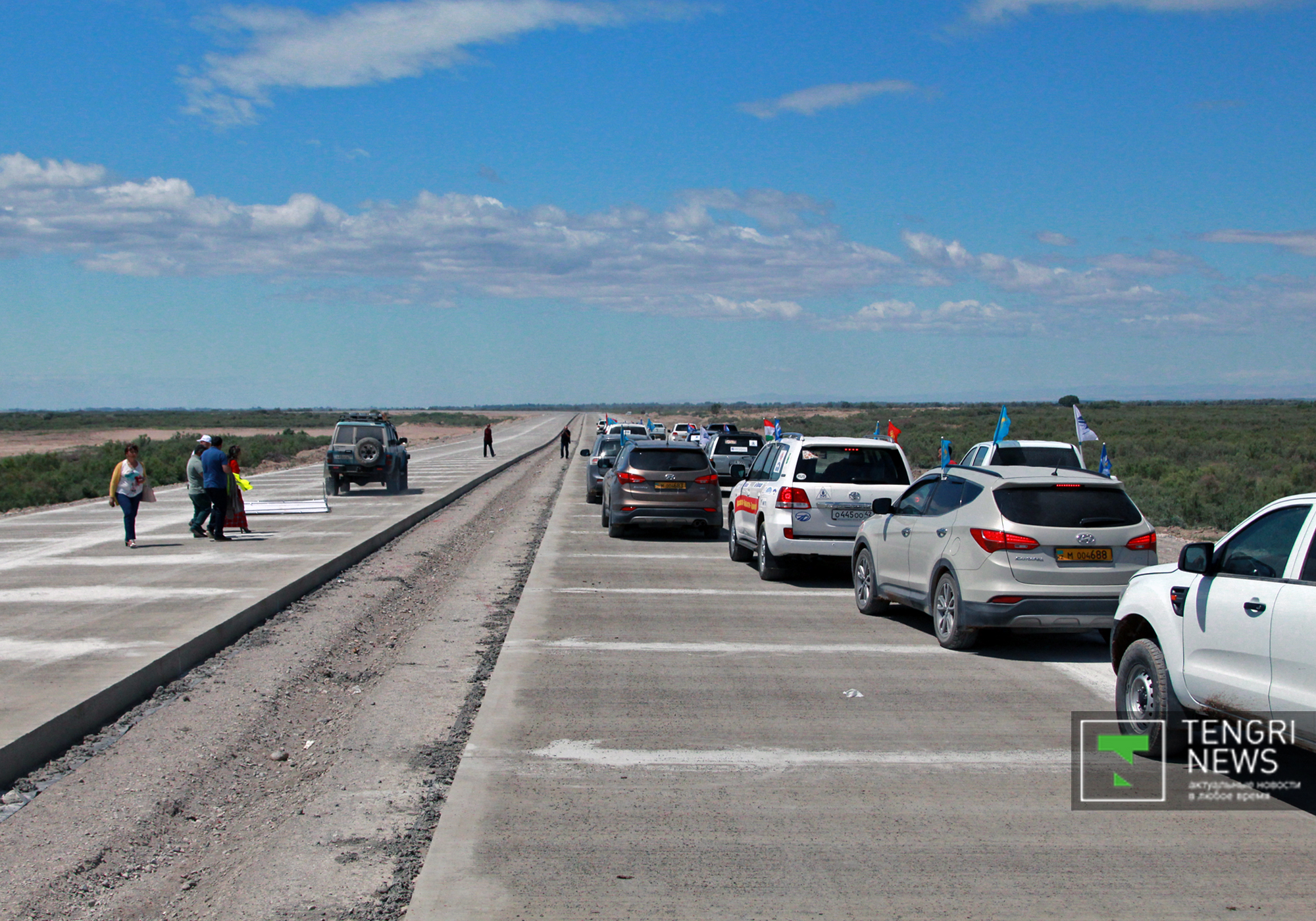 Участники автопробега останавливались на разных участках трассы Алматы - Хоргос и смотрели на ход строительства.