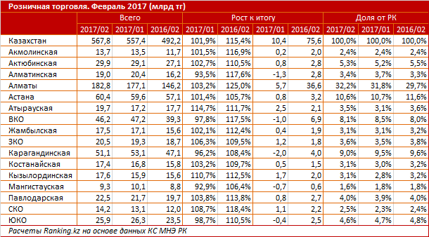 В феврале 2017 года объемы розничной торговли в Казахстане составили 567,8 миллиарда тенге. Это на 15,4 процента больше, чем годом ранее, и на 1,9 процента больше, чем в январе, передает Tengrinews.kz со ссылкой на исследование Ranking.kz.