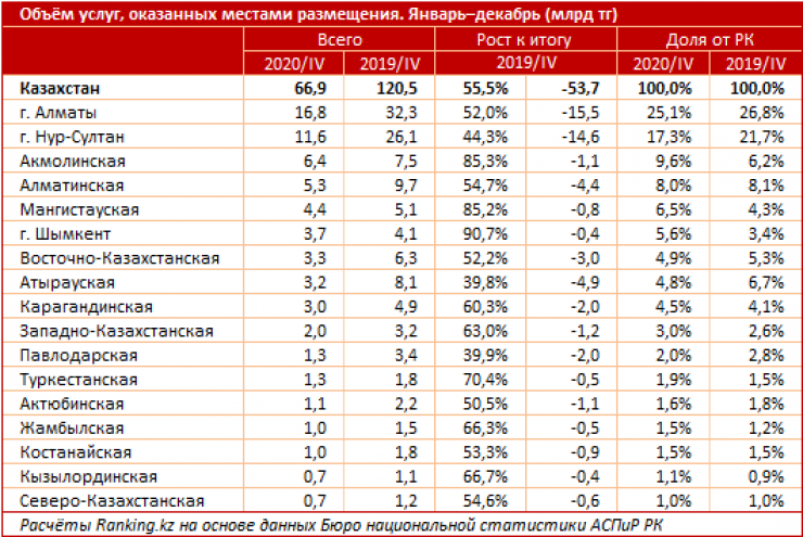 Аналитики подсчитали, что за январь - декабрь 2020 года объем услуг, оказанных гостиницами, мотелями, хостелами и прочими местами размещения, составил в Казахстане лишь 66,9 миллиарда тенге - ожидаемо сразу на 44,5 процента меньше, чем годом ранее. Для сравнения: в январе - декабре 2019-го показатель достигал 120,5 миллиарда тенге, увеличившись на 15,9 процента за год.