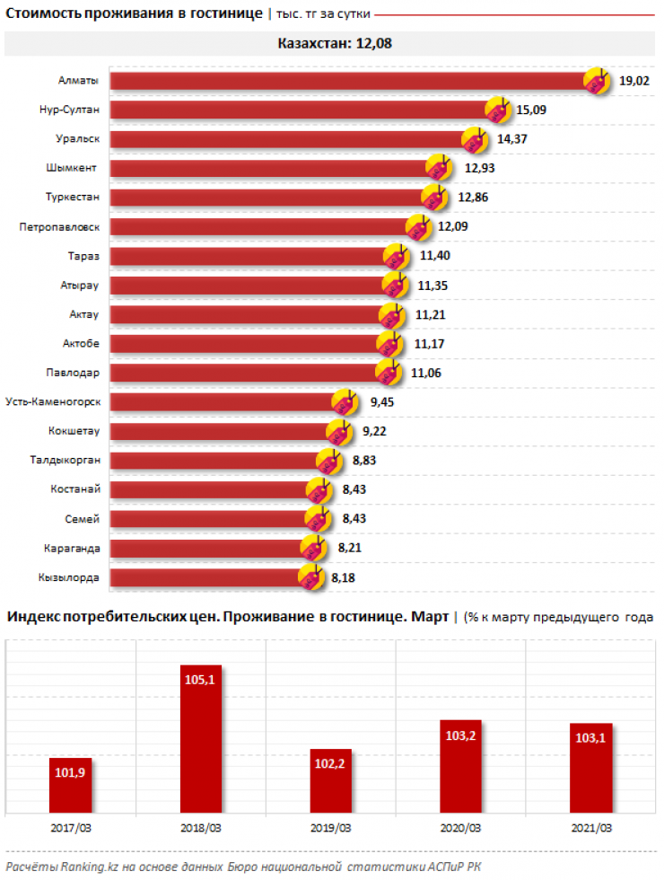 В марте этого года средняя стоимость проживания в гостиницах составила 12,1 тысячи тенге за сутки. Дороже всего среди крупных городов и мегаполисов страны проживание обходится в Алматы (19 тысяч тенге ), Нур-Султане (15,1 тысячи тенге ) и Уральске (14,4 тысячи тенге за сутки). Дешевле всего стоит проживание в гостиницах Кызылорды - всего 8,2 тысячи тенге за сутки.