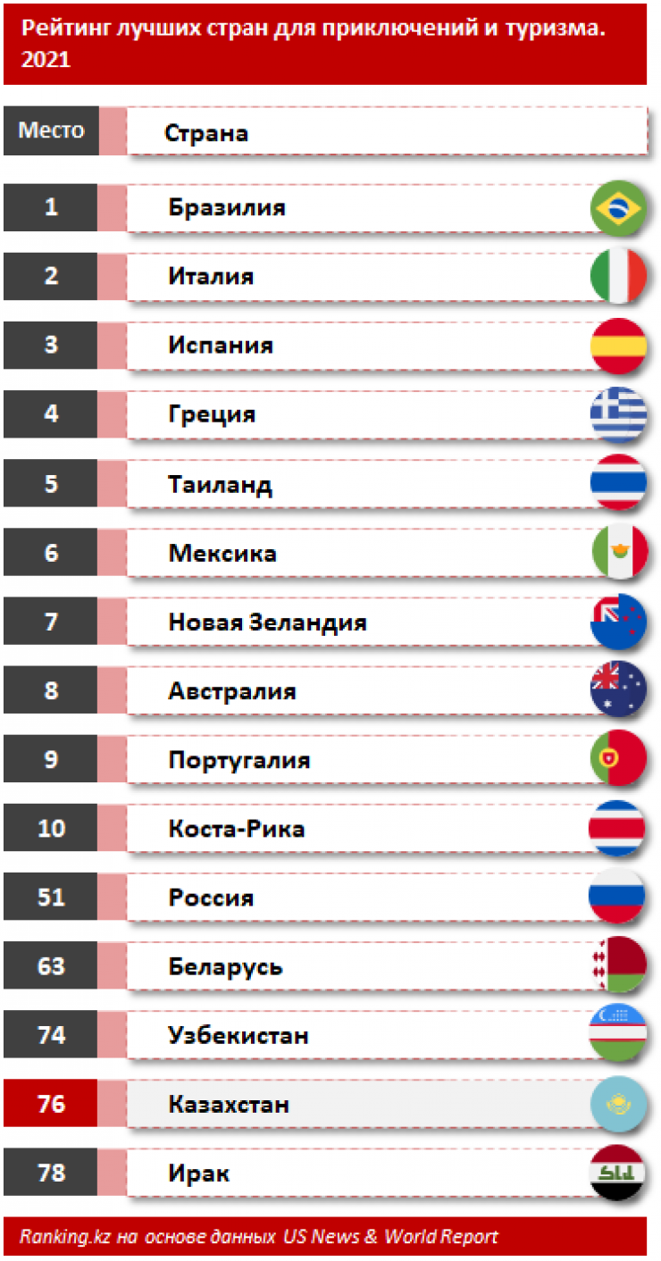 В рейтинге лучших стран для приключений и туризма Казахстан занял одно из последних мест в мире: 76-е из 78. Ниже нашей страны оказались лишь Ирак и Оман. Казахстану присудили 4,4 балла из 100 возможных, передает Tengrinews.kz со ссылкой на Ranking.kz.