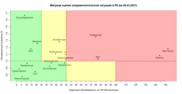 На этом графике показано, в какой зоне находится каждый регион. Но также можно увидеть точку "РК", она показывает, в какой зоне находится наша страна в целом. Еще в начале марта Казахстан уверенно находился в "зеленой" зоне. В "желтой" зоне страна оказалась 8 марта.