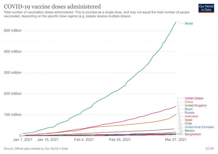 По данным сайта Our World in Data, число людей, получивших вакцину от коронавируса, превысило 500 миллионов человек. Лидируют по числу вакцинированных США (Moderna, Pfizer/BioNTech), Китай (Sinovac, Sinopharm), Великобритания (Oxford/AstraZeneca, Pfizer/BioNTech), Бразилия (Oxford/AstraZeneca, Sinovac) и Россия ("Спутник V"). Данные о том, какие вакцины используют страны, взяты с сайта РБК.