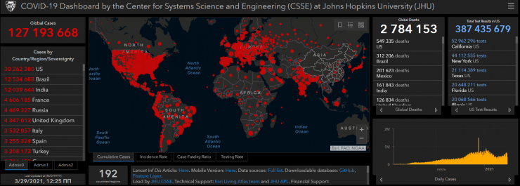 По данным Университета Джонса Хопкинса, по числу заражений первое место в антирейтинге занимают США - более 30 миллионов, следом идет Бразилия - 12,5 миллиона, на третьем месте Индия - чуть больше 12 миллионов случаев.