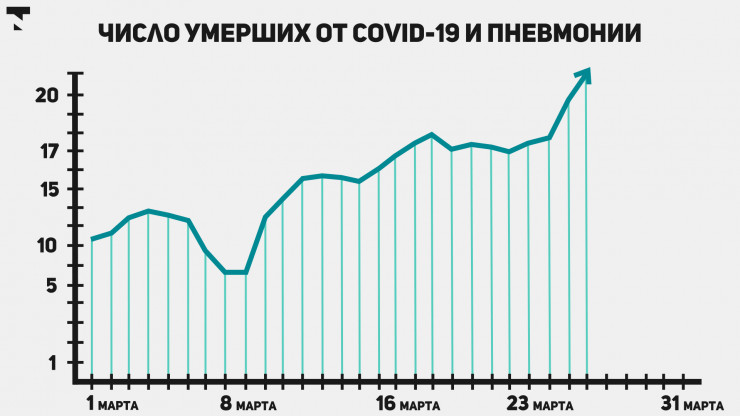 По данным на 28 марта, 28 442 заболели КВИ+ и 242 умерли с начала месяца. За тот же срок с пневмонией КВИ- поступили 1 128 заболевших, умерли 54 человека.