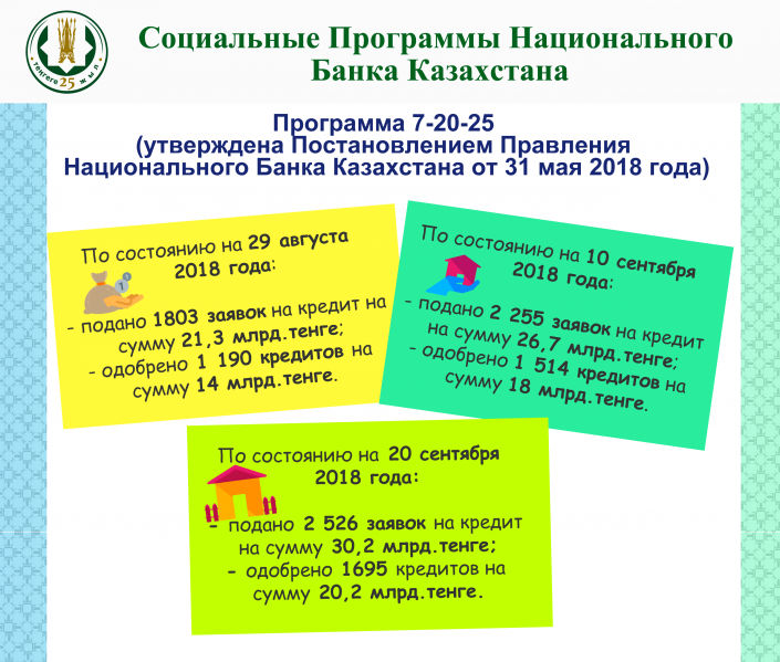 Программа "7-20-25" действует уже три месяца. По состоянию на 27 сентября банки одобрили одобрено 2052 кредитов на сумму 24,5 миллиарда тенге.