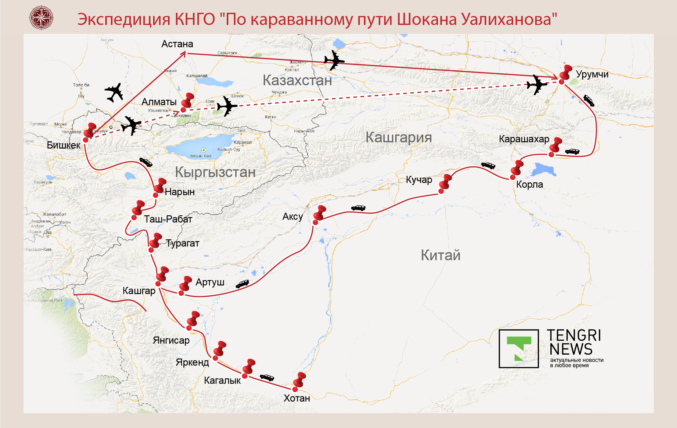 Отметим, что экспедиция является проектом Республиканского общественного объединения "Казахстанское национальное географическое общество" и посвящена 180-летию со дня рождения великого казахского ученого, путешественника Шокана Уалиханова. Экспедиция пройдет в период с 24 июля по 4 августа 2014 года по территории Китая и Кыргызстана по караванному пути Уалиханова. Маршрут протяженностью 6 тысяч километров будет выглядеть следующим образом: Урумчи - Карашахар - Корла - Кучар - Аксу - Кашгар - Артуш - Янгисар - Яркенд - Кагалык - Хотан - Кашгар - Турагат - Нарын - Таш-Рабат - Бишкек.