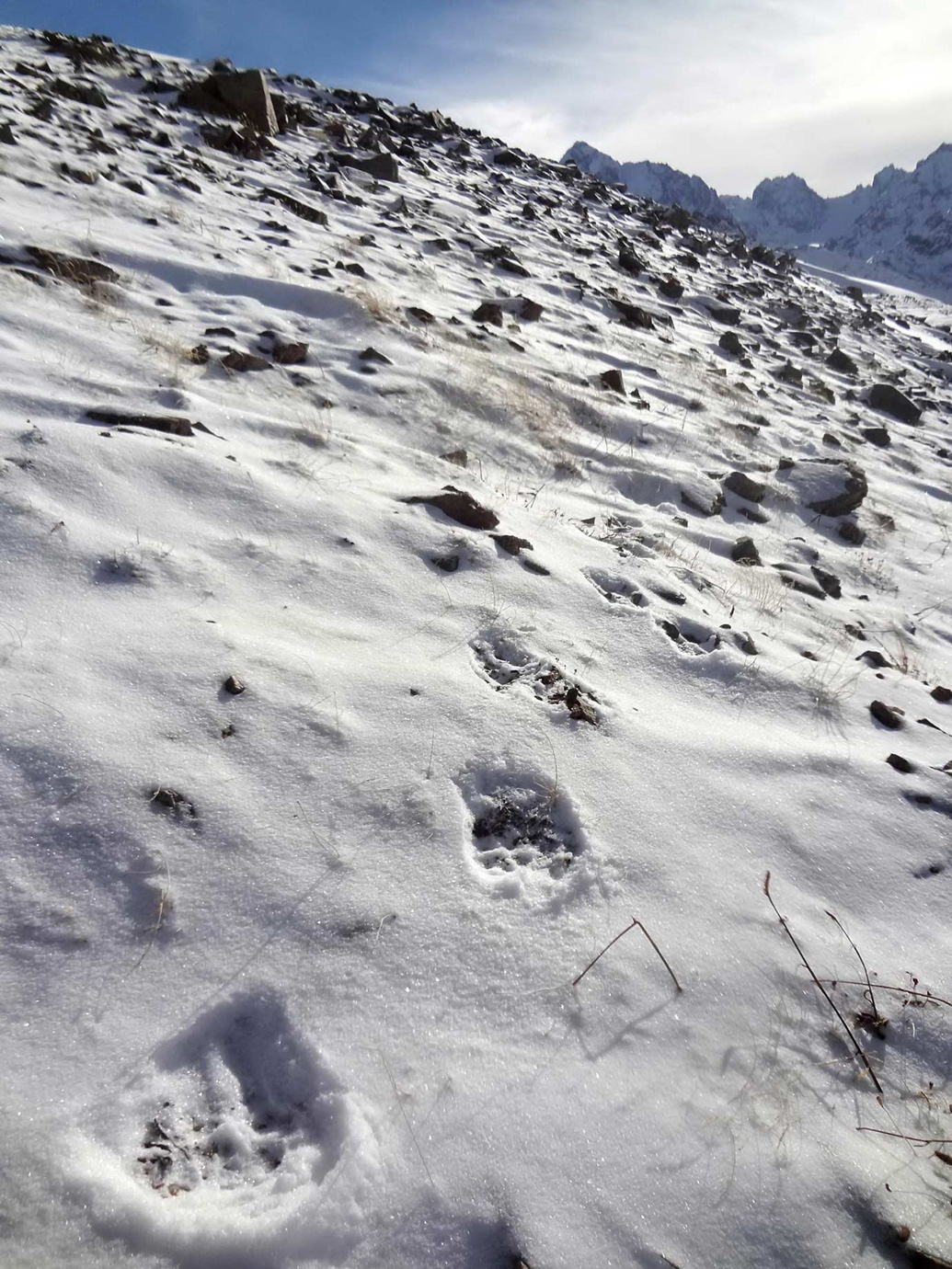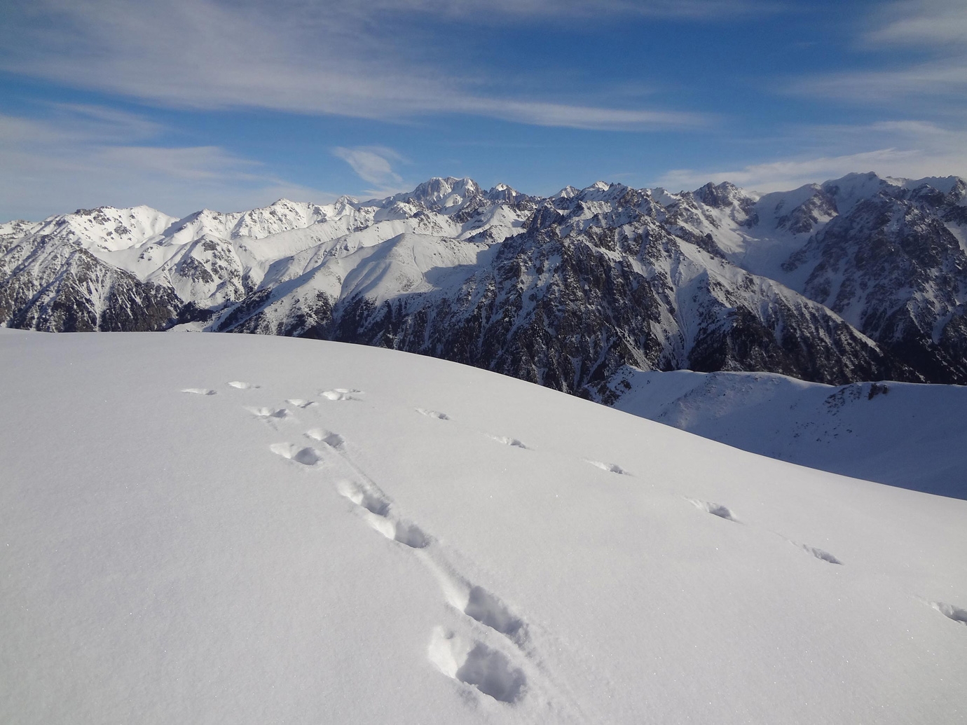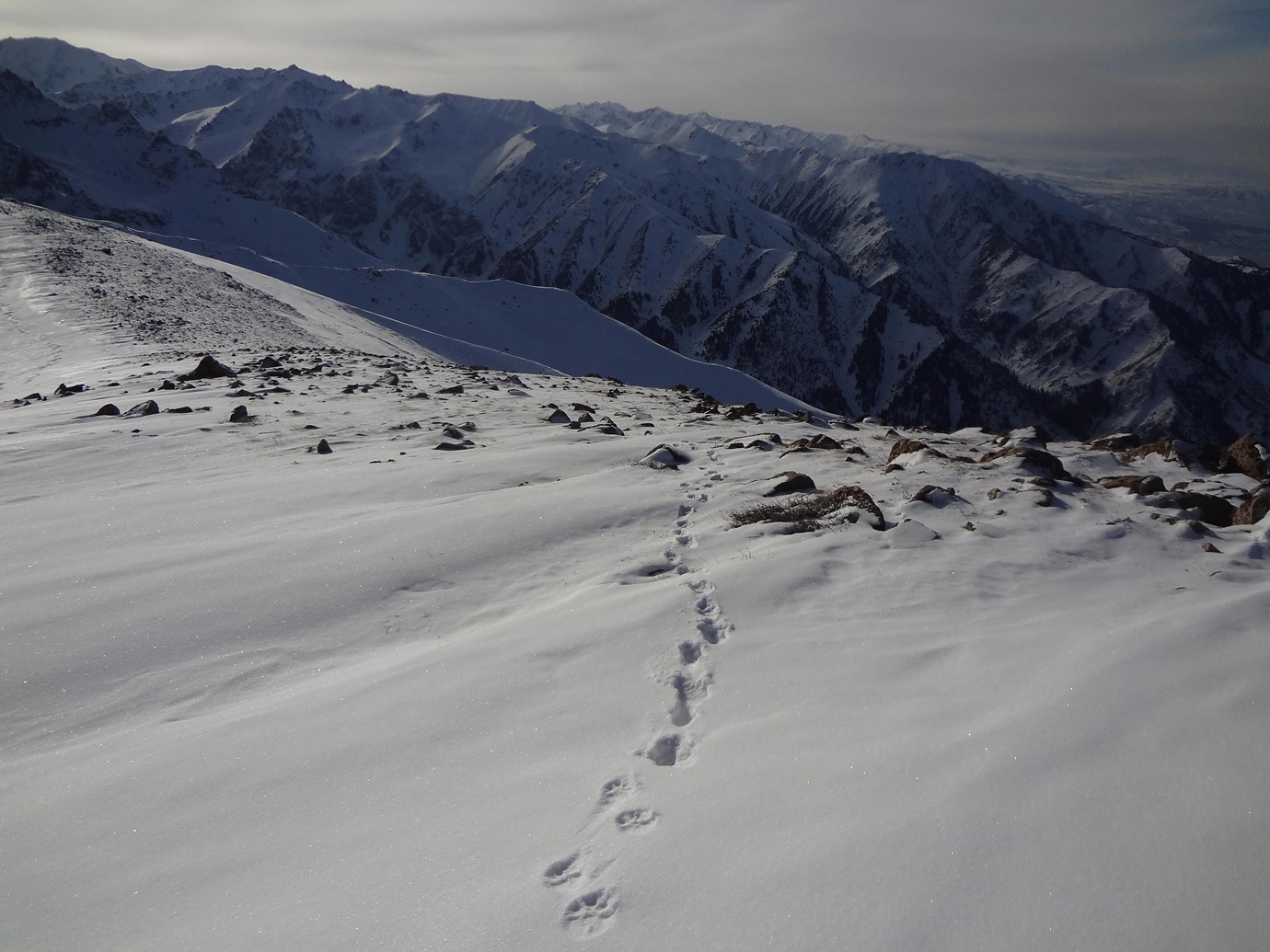 "На Панораме было безветренно и тепло, метрах в 60 дальше по гребню (в сторону пика Комсомол) заметили трек крупных следов. Явно не горностая. На всякий случай сфотографировали. Решили пройти дальше. Следы тянулись по гребню и плавно уводили в сторону Левого Талгара. Двигались медленно, вглядываясь в рельеф. Вдруг в глубине очередного понижения что-то шевельнулось - какое-то вытянутое темное пятно, левее камней и ближе к снежному карнизу. Мы одновременно остановились и стали всматриваться в тени на гребне. Непонятное пятно тоже замерло, а через пару секунд крутанулась на месте, и мы увидели силуэт животного. Почти как на гербе города", - вспоминает турист.