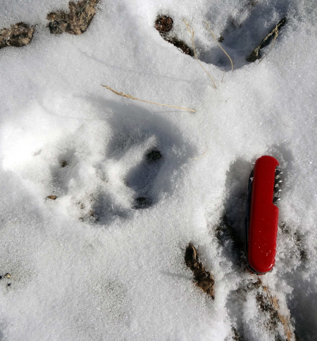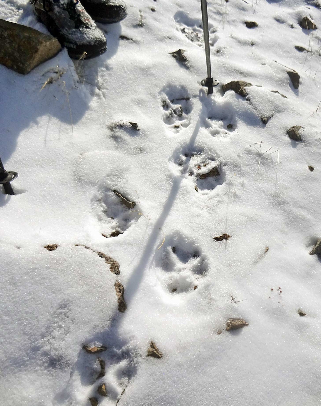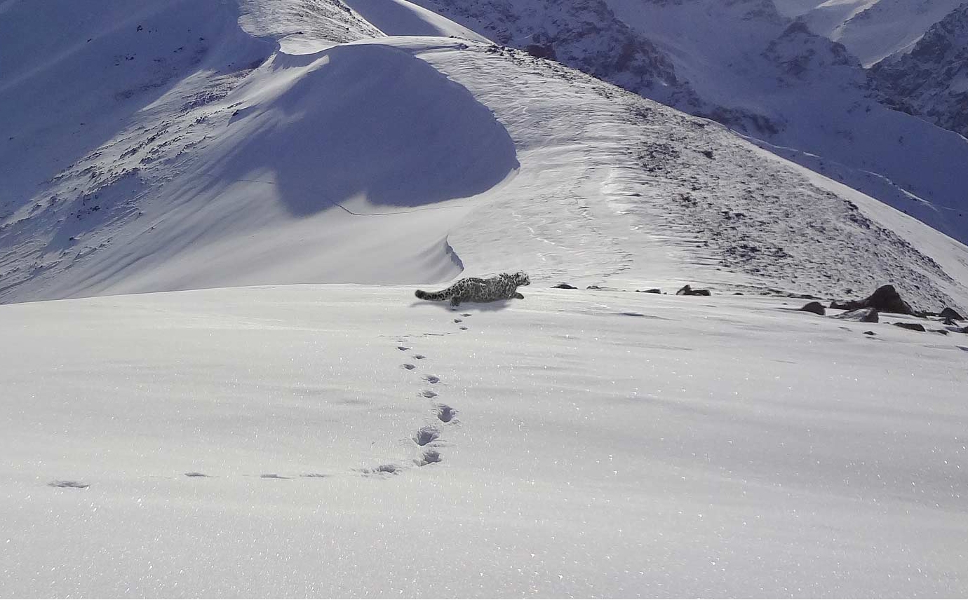"На Панораме было безветренно и тепло, метрах в 60 дальше по гребню (в сторону пика Комсомол) заметили трек крупных следов. Явно не горностая. На всякий случай сфотографировали. Решили пройти дальше. Следы тянулись по гребню и плавно уводили в сторону Левого Талгара. Двигались медленно, вглядываясь в рельеф. Вдруг в глубине очередного понижения что-то шевельнулось - какое-то вытянутое темное пятно, левее камней и ближе к снежному карнизу. Мы одновременно остановились и стали всматриваться в тени на гребне. Непонятное пятно тоже замерло, а через пару секунд крутанулась на месте, и мы увидели силуэт животного. Почти как на гербе города", - вспоминает турист.