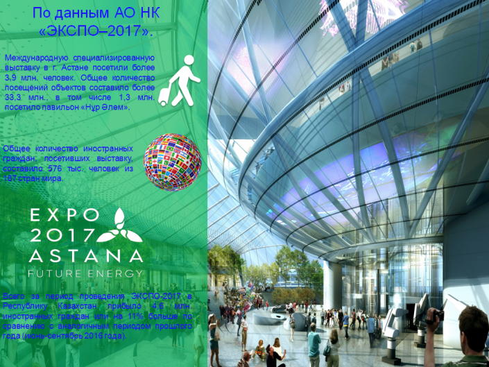 "По данным АО НК "ЭКСПО-2017", международную специализированную выставку в Астане посетили более 3,9 миллиона человек. Общее количество посещений объектов составило более 33,3 миллиона, в том числе 1,3 миллиона посетили павильон "Нұр Әлем". Общее количество иностранных граждан, посетивших выставку, составило 576 тысяч человек из 187 стран мира. Всего за период с июня по сентябрь 2017 года в Республику Казахстан прибыло 4,6 миллиона иностранных граждан", - добавили в Комитете по статистики РК.