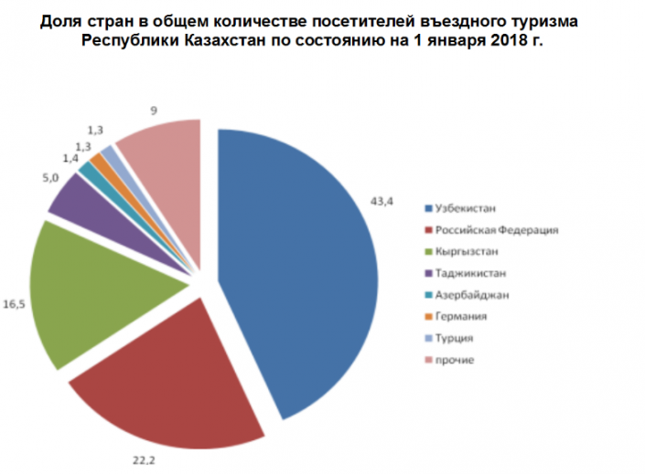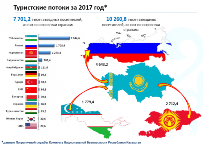 По данным Комитета по статистике, за 2017 год Казахстан посетили 7 701 200 туристов. Лидирует Узбекистан с 3 344 600 туристами, Россия - 1 708 900 человек, Кыргызстан - 1 273 400 туристов.