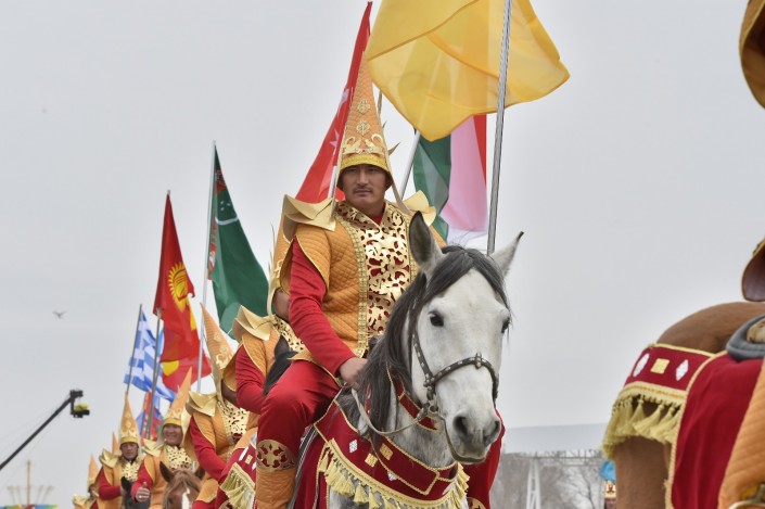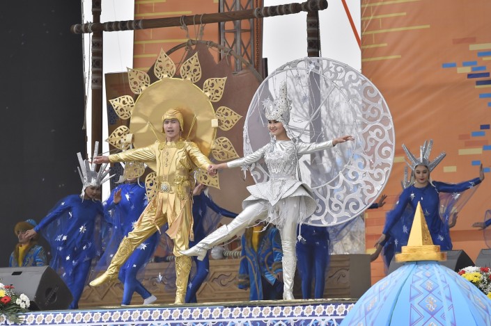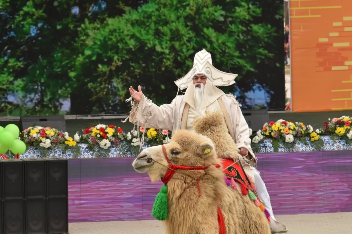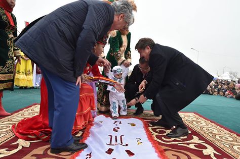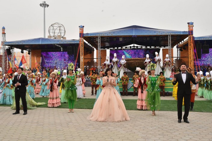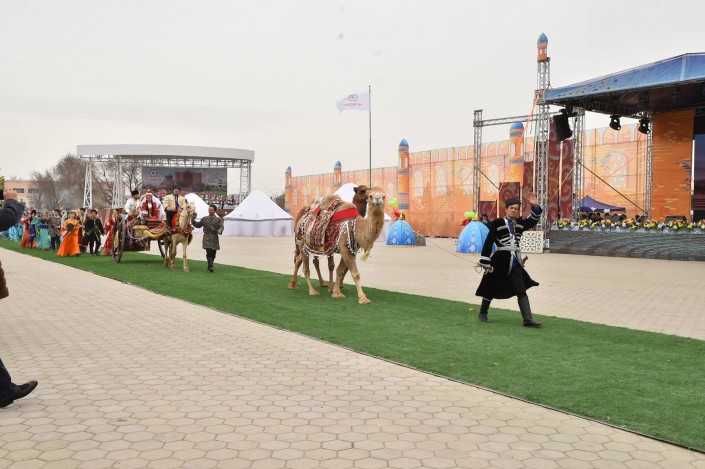 На сцене в это время развернулось театральное представление. Актеры были в образах Арыстан баба, Яссауи, аль-Фараби, Коркыт Ата, казахских ханов, а около 500 танцоров удивили всех масштабной хореографической постановкой. Кроме того, по площади прошел караван "Наурыз" из 18 верблюдов и 30 лошадей. Затем в присутствии тысяч человек малышу из Туркестана провели обряд тусаукесу. Путы перерезали аким ЮКО Жансеит Туймебаев и министр культуры и спорта Арыстанбек Мухамедиулы.