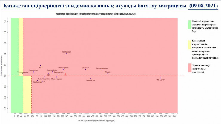 По данным матрицы оценки эпидемиологической ситуации в регионах Казахстана на 9 августа:
