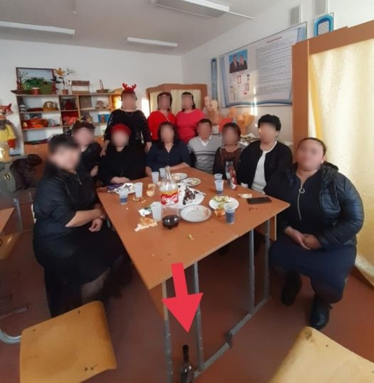 "Түркістан облысы, Сарыағаш ауданы, нөмірі 17-ші Ы.Алтынсарин жалпы орта мектеп мұғалімдері, биология кабинетінде, сабақ уақытында спирттік ішімдік ішіп, той тойлап отыр", - делінген жазбада.