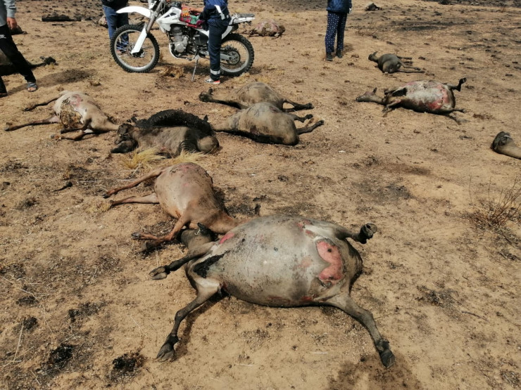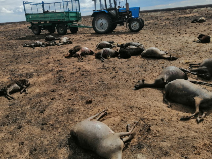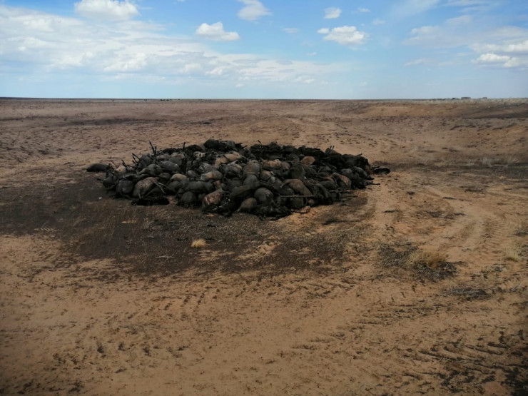 Туши мертвых животных закопали в яме неподалеку от села Жалгызапан. На место инцидента приехали представители овцеплеменного завода, чтобы подсчитать убытки.