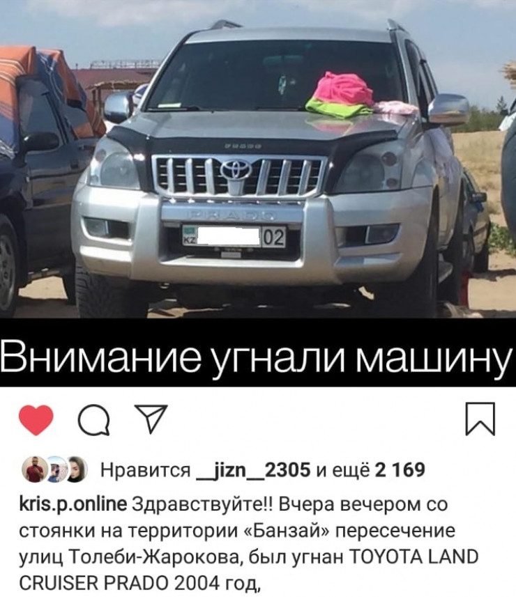 Ранее сообщалось, что жители Алматы и Алматинской области пожаловались на участившиеся угоны внедорожников Toyota. Кражи авто происходили в период с 27 по 30 января. Известно как минимум о трех угнанных машинах за это время.