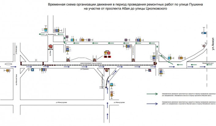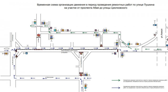 В этой связи с 10 часов 13 сентября до 5 часов 14 сентября и с 10 часов 14 сентября до 5 часов 15 сентября по улице Пушкина в направлении движения от улицы Циолковского в сторону проспекта Абая будет ограничено движение автотранспортных средств. В период проведения ремонтных работ по улице Пушкина будет ограничено движение грузового транспорта.