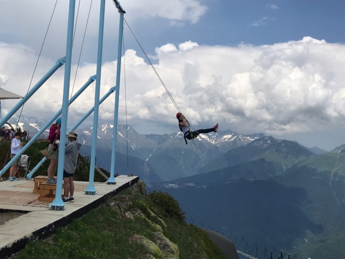 Высокогорные качели расположены на краю живописного ущелья, раскачавшись на которых вы не только испытаете чувство невесомости и полета над пропастью, но и сможете насладиться открывающейся панорамой гор Кавказа.