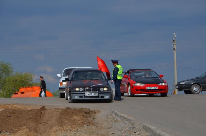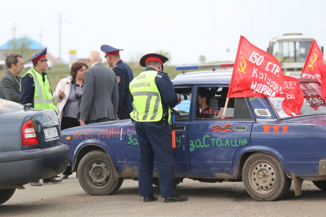 Сформировавшись, колона автомобилей начала выезжать, но у входа в торговый центр их стали останавливать полицейские. Стражи порядка проверяли документы и заставляли убирать флаги. Спустя какое то время, видимо из-за большого потока машин, проверка прекратилась и гаишники стали направлять автомобили в разные стороны. В итоге вместо одного автопробега получилось несколько десятков.