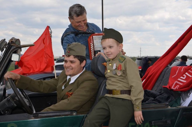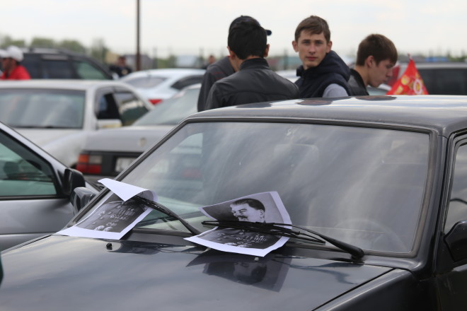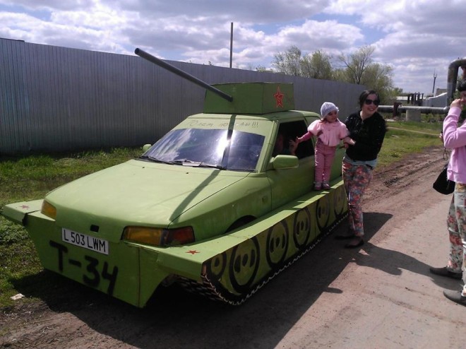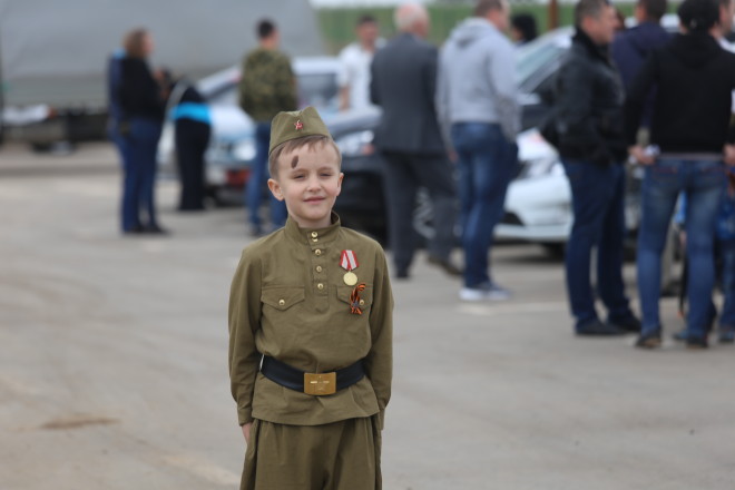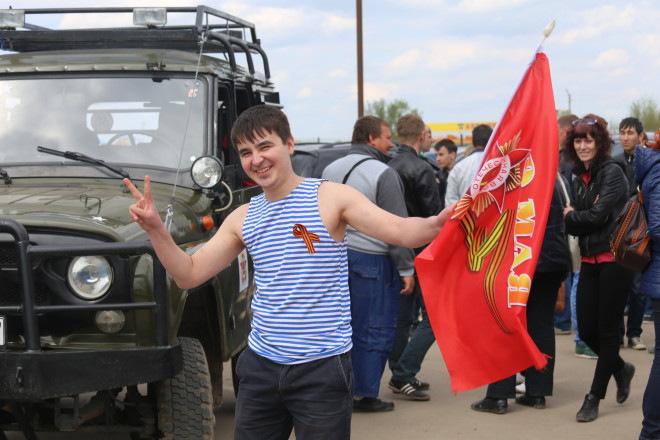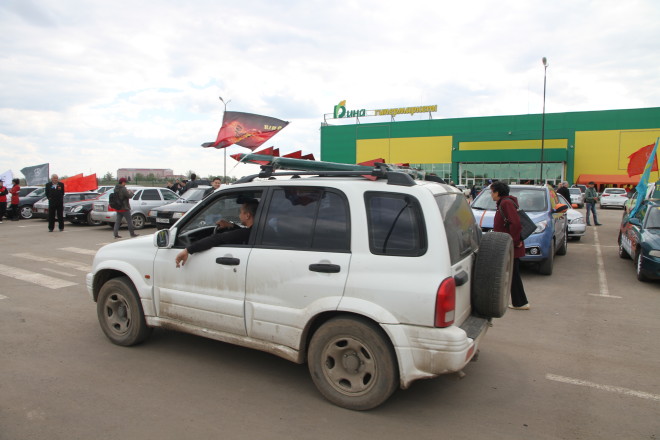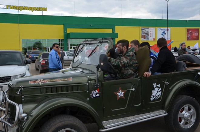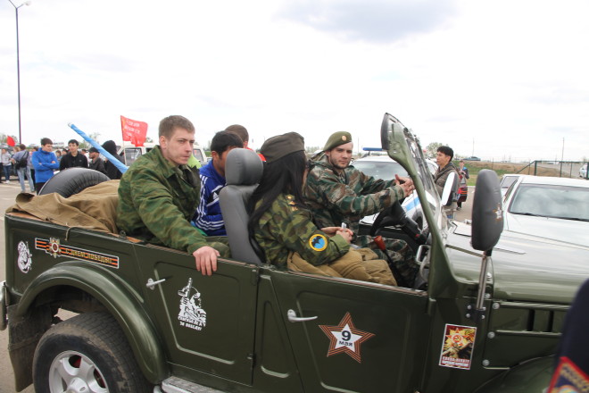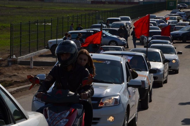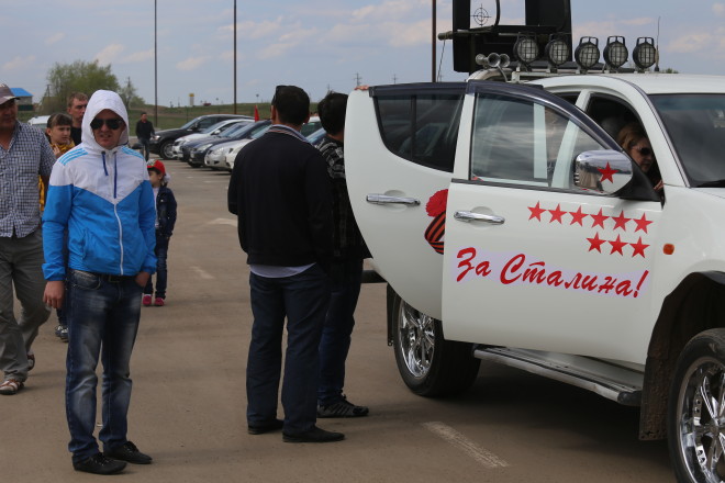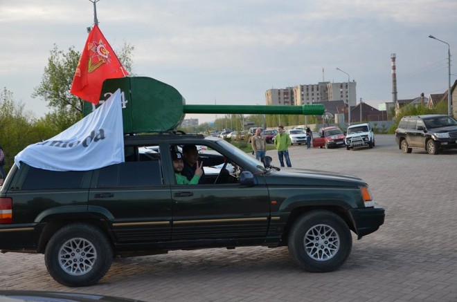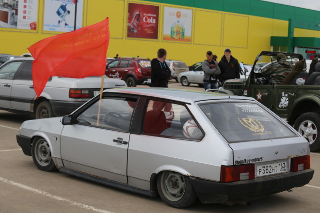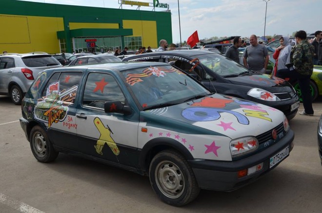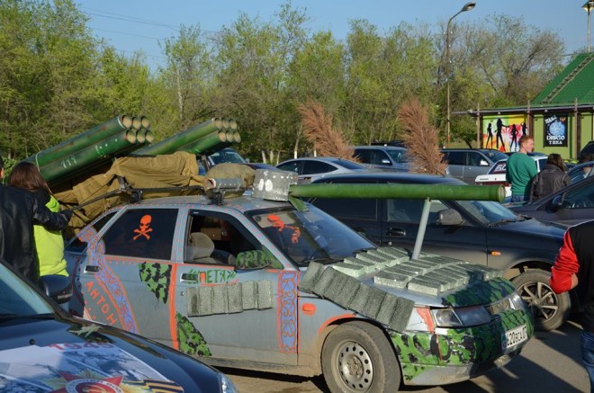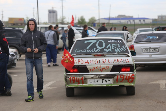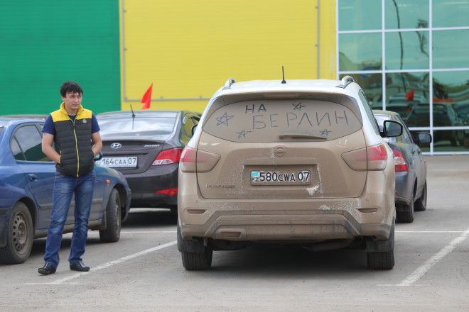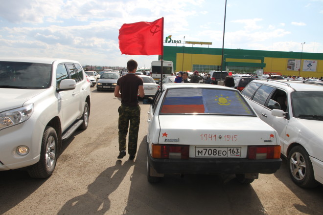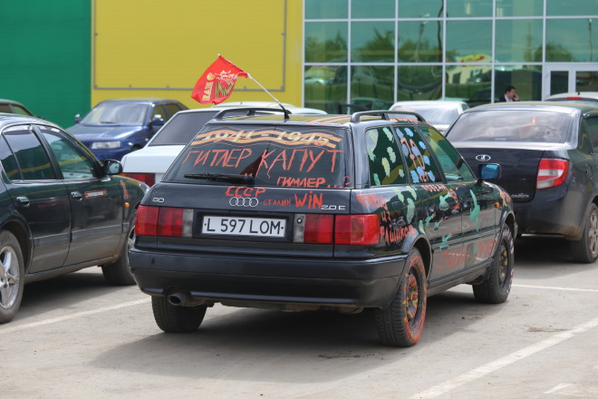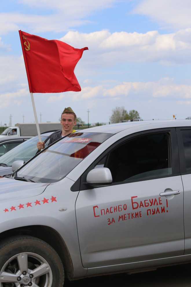 9 мая участники автопробега собрались на стоянке возле торгового центра "Дина". Все машины были разукрашены военной символикой и флагами СССР, на многих имелись надписи "Спасибо деду за победу", "На Берлин", "Помним и гордимся!", "За Сталина!", "Спасибо бабуле за меткие пули" и прочие. Водители были одеты в гимнастерки, пилотки военного времени.
