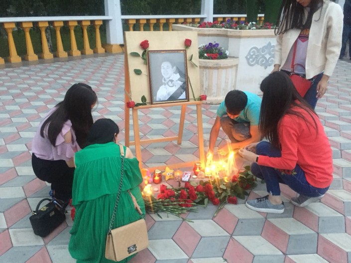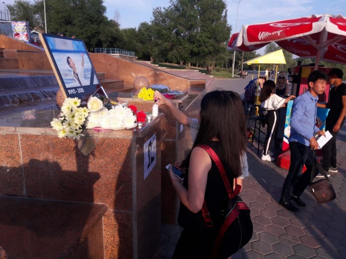 Талдыкорганцы приносили цветы и свечи к мемориалу Денису Тену у дворца спорта "Жастар".