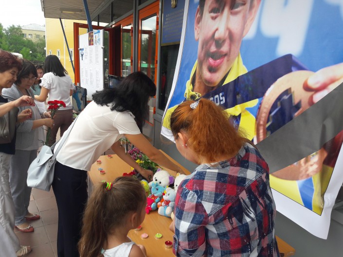 В Уральске у ледового дворца спорта собрались сотни горожан. У входа соорудили уголок, посвященный именитому спортсмену. Сюда люди несли цветы и мягкие игрушки. На экране демонстрировали фрагменты из выступлений Дениса Тена.