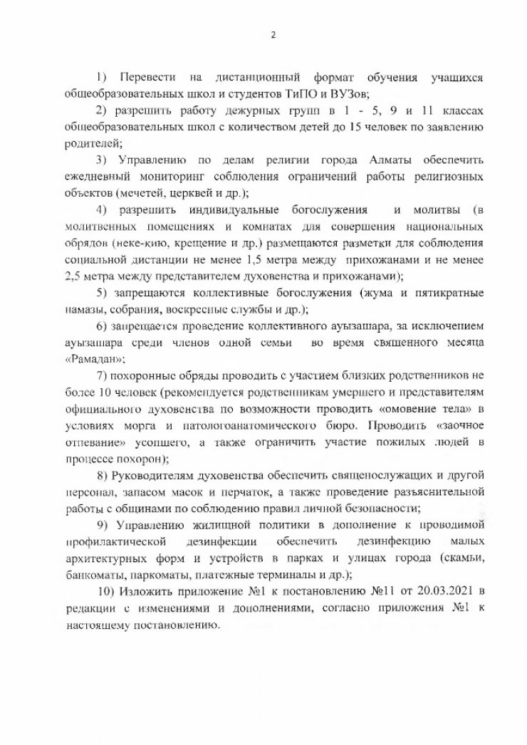 3) Управлению по делам религии города Алматы обеспечить ежедневный мониторинг соблюдения ограничений работы религиозных объектов (мечетей, церквей и др.);