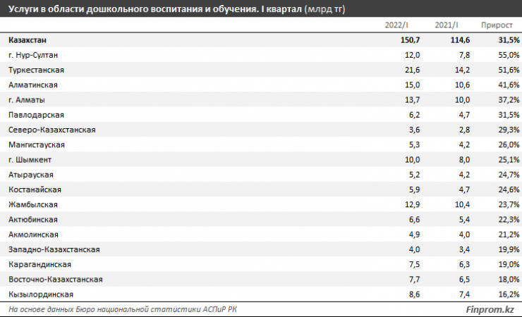 Общий объем услуг в области дошкольного воспитания и обучения в Казахстане составил 150,7 миллиарда тенге в первом квартале года - плюс 31,5 процента.