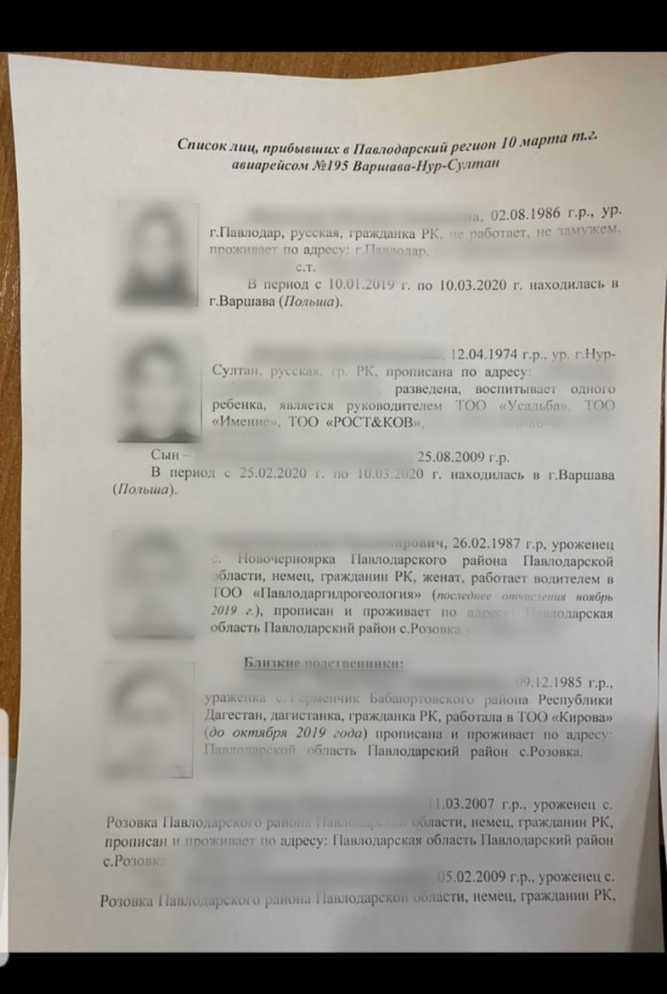 Речь идет о людях, вернувшихся из Польши 10 марта этого года. В рассылке сообщается, что они прилетели рейсом № 195 Варшава – Нур-Султан. Кроме фото, имен и фамилий павлодарцев, в информации указываются даты рождения, места проживания, домашние адреса и даже номера сотовых телефонов.