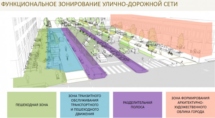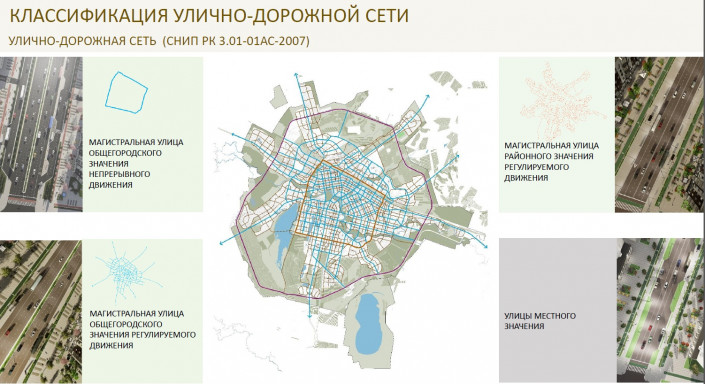 Для функционального зонирования всего улично-дорожного пространства города на основе Генерального плана и СНиП РК 3.01-01АС-2007 была проведена классификация улично-дорожной сети Нур-Султана. Протяженность улично-дорожной сети составляет 2387,3 километра.