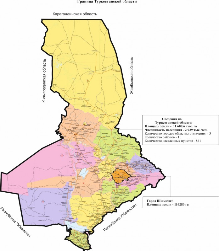 Территория Туркестанской области составляет 11 608,6 тысяч гектаров. Северная граница проходит по существующим границам территорий, находящихся в административном подчинении Жамбылской области; северо-западная граница проходит по существующим границам территорий, находящихся в административном подчинении Карагандинской области; западная граница проходит по существующей границе Кызылординской области.