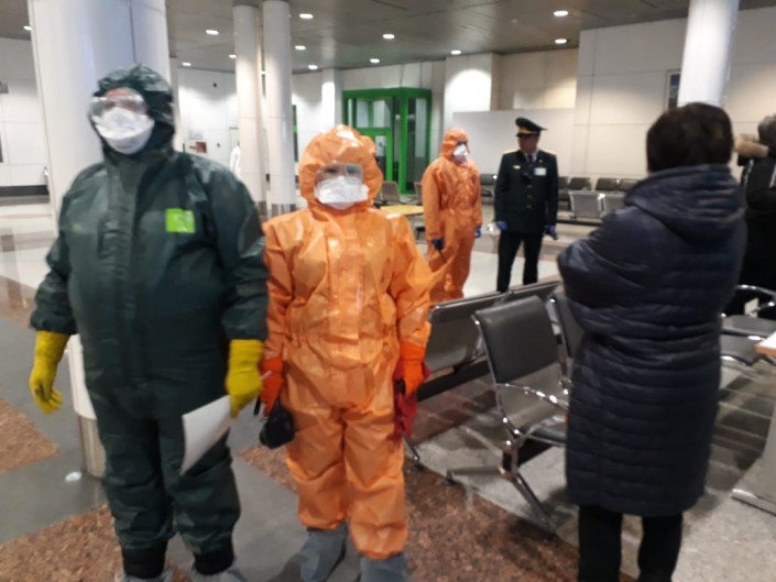 К борту выехала машина скорой помощи с инфекционистом-консультантом, двумя эпидемиологами и группой для дезинфекционной обработки самолета. На место приехал главный санитарный врач страны Жандарбек Бекшин. Он объяснил ситуацию лицам, встречающим пассажиров.