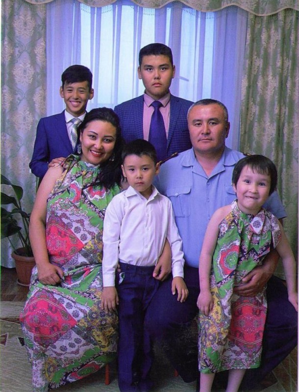 "У меня прекрасная жена и трое замечательных сыновей, теперь еще и дочь, о которой я  всегда мечтал.  Старший сын Алдияр закончил  восьмой класс, занимается кикбоксингом,  средний сын Улан - борьбой,  а младший сын  Жанали пойдет в этом году в первый класс вместе со своей сестренкой Умидой. У нас дружные и самостоятельные  дети, могут  справиться  с любыми домашними обязанностями: убраться в  доме, обед разогреть и приготовить что-то несложное, если нужно", - рассказал о своей семье мужчина.