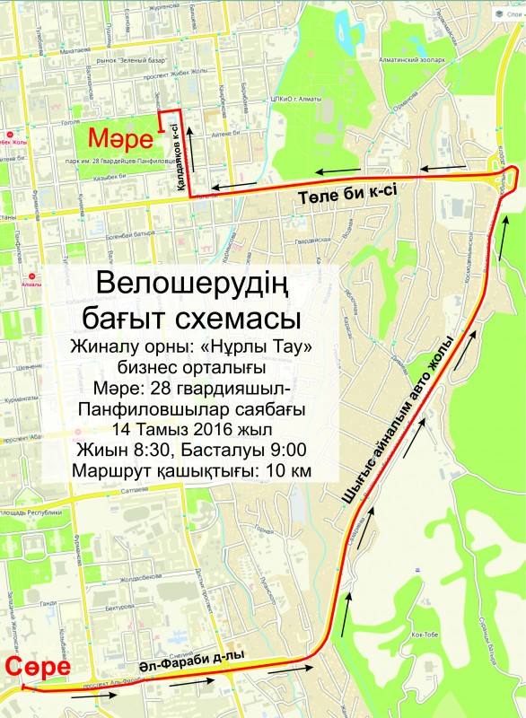 Сбор участников начнется в 08.30 утра, а сам велопробег стартует в 09.00 с территории бизнес-центра "Нурлы-Тау" на пересечении проспекта Аль-Фараби и улицы Желтоксан. Финиширует велозаезд в Парке имени 28 гвардейцев-панфиловцев.