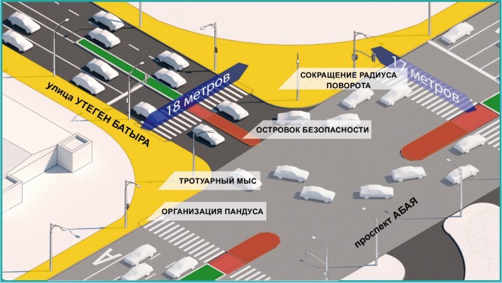 "В целом по городу при активном участии горожан выявлены 72 проблемных участка с высоким уровнем аварийности, где по аналогии с передовыми мегаполисами планируется сузить радиус поворотов, увеличить интервал светофоров для пешеходов, перенести стоп-линии и другое. Кроме того, запланировано строительство 100 новых пешеходных переходов. По многочисленным просьбам горожан на 50 участках будут обустроены островки безопасности, разделяющие широкую проезжую часть. Возле социальных и образовательных объектов принято решение организовать приподнятые трапециевидные пешеходные переходы", - сообщил аким.