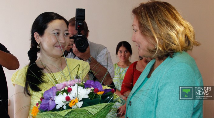 Заместитель акима Алматы Зауреш Аманжолова поздравляет Баян Абдуллину. Фото © Роза Есенкулова