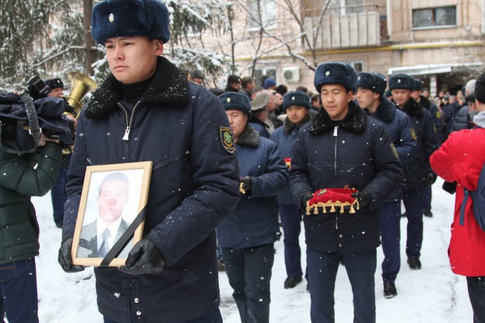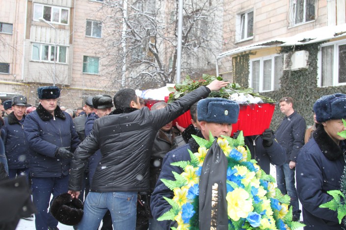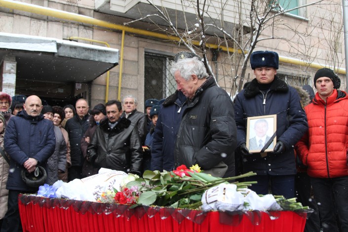 Траурная панихида началась в 11.00 в доме погибшего. Проводить пилота в последний путь пришли родственники, близкие друзья и знакомые, а также сослуживцы и боевые товарищи. Всего собралось свыше 100 человек, в числе которых военный оркестр Пограничной службы КНБ.
