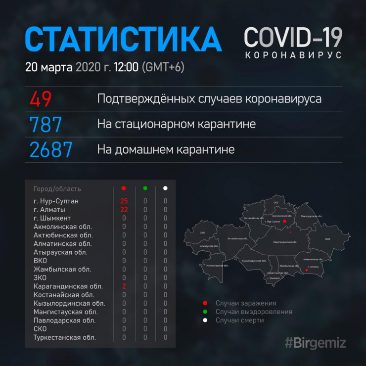 К этому часу в стране подтверждено 49 случаев заражения коронавирусом, из них в Нур-Султане - 25, в Алматы - 22 и два - в Караганде.