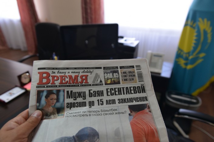 Сегодня директор кризисного центра для женщин, ставших жертвами домашнего насилия, устроил столичным журналистам экскурсию. Перед началом записи интервью в приемной руководителя некоторые телеоператоры снимали что-то на камеру. В объектив попала газета со статьей об избиении Баян Есентаевой.