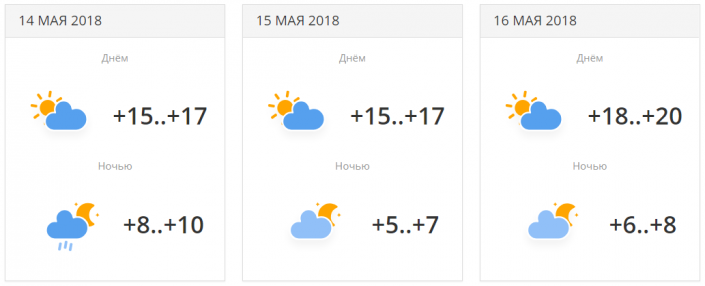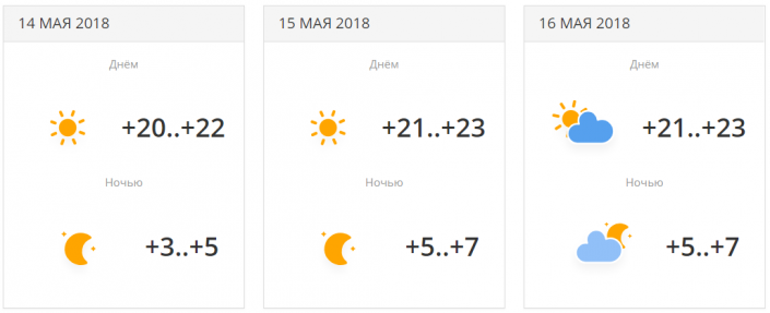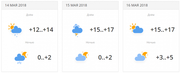 В городе прогнозируется три дня осадков с переменной облачностью. Температуры будут находиться в районе +19...+23 градусов днем. 16 мая ночью ожидается понижение температуры до +7...+9 градусов.