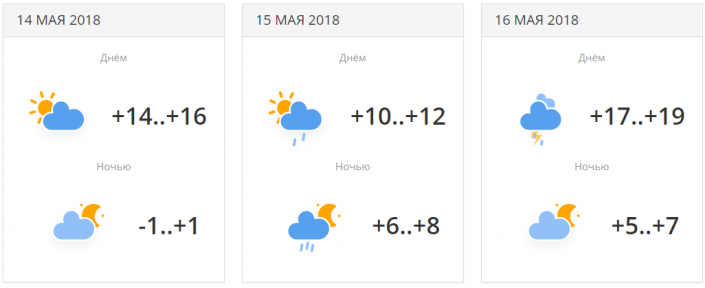 14 мая ночью ожидается минусовая температура: -1...+1. 16 мая - сильный дождь с грозой, +17...+19 градусов тепла.