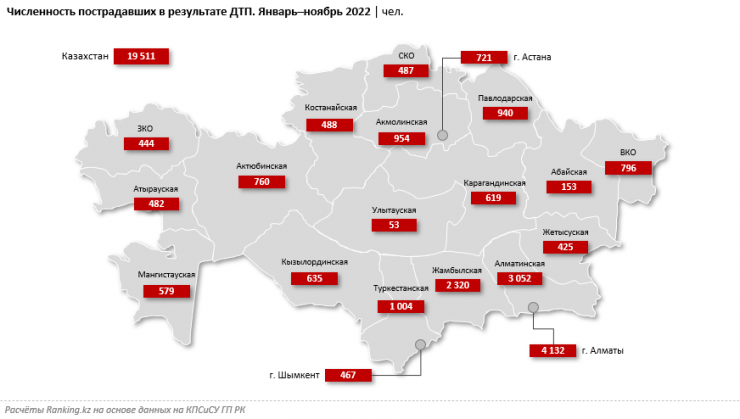 В региональном разрезе больше всего пострадавших в ДТП насчитывалось в Алматы (4,1 тысячи человек), а также в Алматинской области (3,1 тысячи человек) и Жамбылской (2,3 тысячи человек) областях.