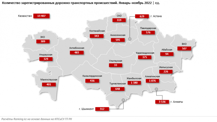 Меньше всего ДТП было зафиксировано в новообразованных областях - Улытауской, Абайской и Жетысуской (33, 94 и 226 случаев соответственно). Напомним: эти области образовались лишь в середине 2022 года, чем и объясняются такие низкие показатели.