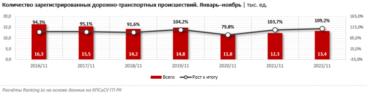 За январь – ноябрь 2022 года в стране в результате ДТП пострадали 19,5 тысячи человек - на 9 процентов больше, чем годом ранее. Среди них численность раненых составила 17,3 тысячи, погибших - 2,2 тысячи человек. В том числе были ранены 9,6 тысячи мужчин и 7,7 тысячи женщин, погибли 1,7 тысячи мужчин и 568 женщин.