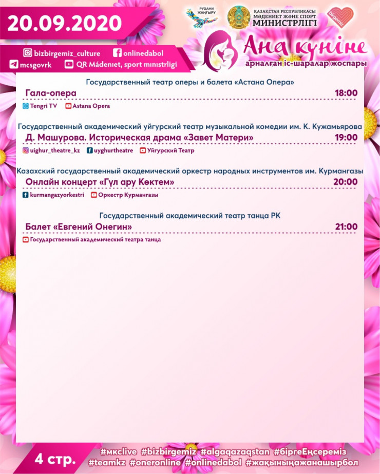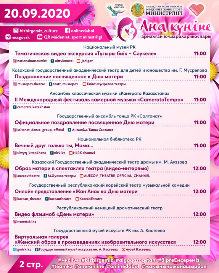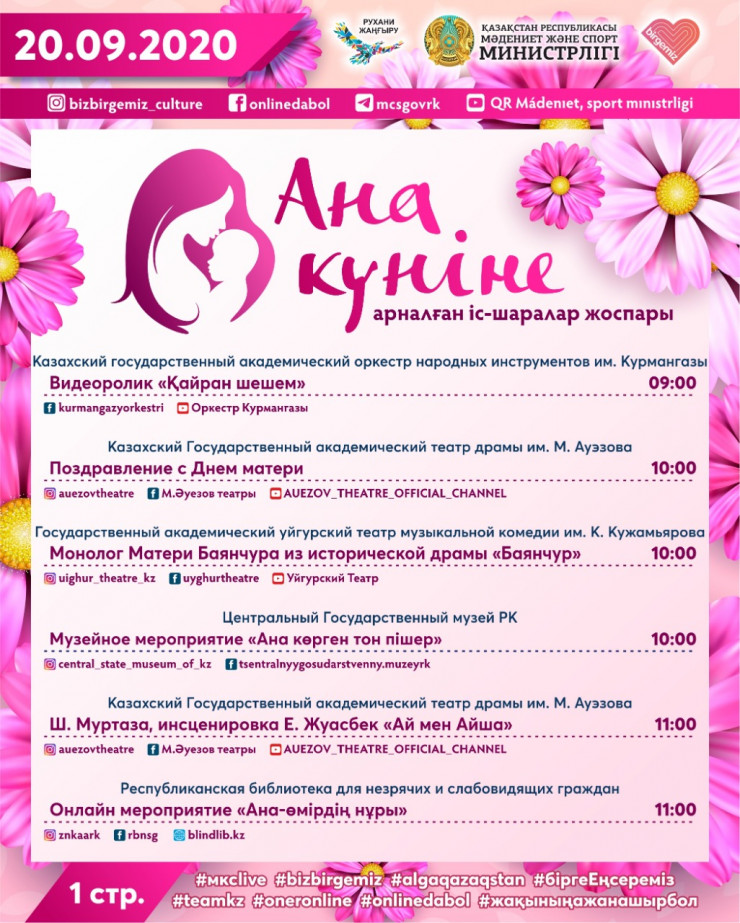 В Министерстве культуры и спорта отметили, что в честь празднования Дня матери запустят флешмоб "Анаға арнау", который будет направлен на сохранение и пропаганду ценности семьи, брака и традиции своего народа.