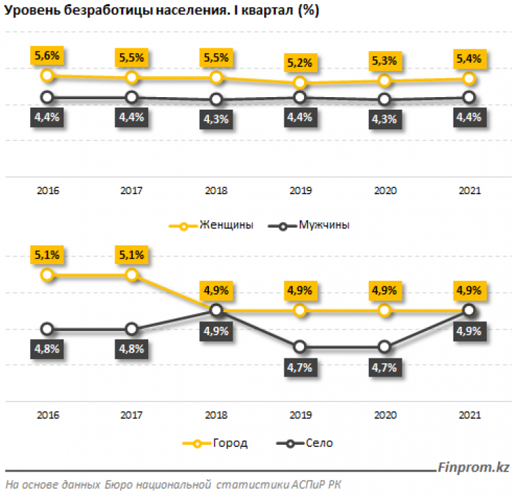 А среди жителей городской и сельской местности в первом квартале 2021 года уровень безработицы сравнялся. При этом если в городской местности показатель не изменился по сравнению с прошлым годом, то в сельской местности он вырос.