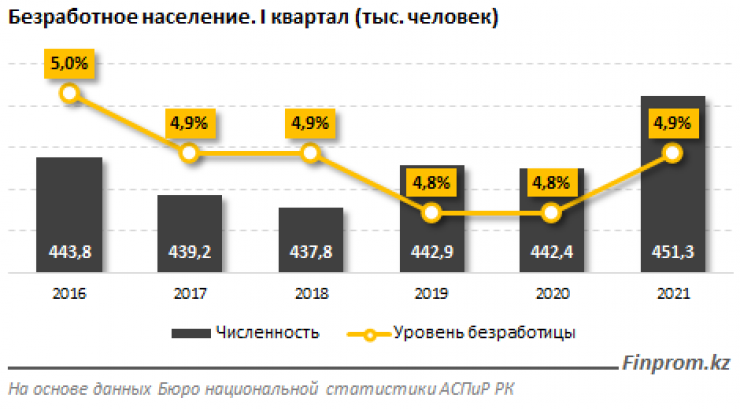 "Среди регионов Казахстана в первом квартале 2021 года уровень безработицы населения варьировался от 4,5 процента в Карагандинской области до 5,2 процента в Туркестанской области и Алматы. Численность безработного населения в Туркестанской области выросла на 2,3 процента, до 42,6 тысячи человек, в Алматы — на 3,4 процента, до 53,2 тысячи человек", - пишут аналитики.