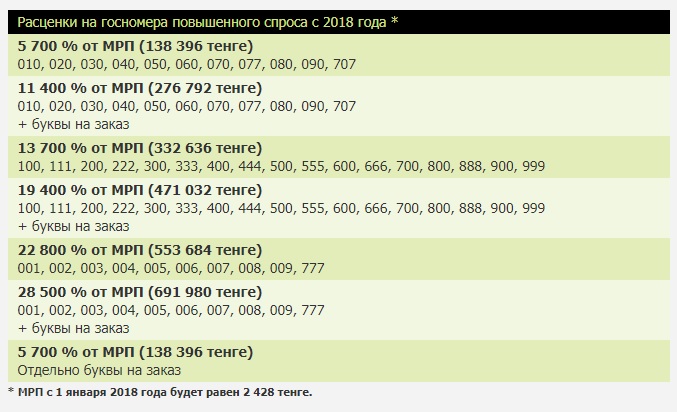 Кроме того, согласно последним изменениям, владельцы транспортных средств при приобретении государственных регистрационных номерных знаков повышенного спроса (к примеру 001, 002, 003, 004, 005, 006, 007, 008, 009,100,111, 200, 222, 300, 333, 400, 444, 500, 555, 600, 666, 700, 777, 800, 888, 900, 999) по своему желанию теперь сможет выбрать комбинацию букв, кроме комбинации из трех одинаковых букв, за которые с 1 января 2018 года вводится повышенная госпошлина.